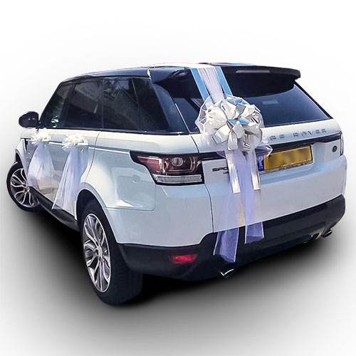 קישוט לרכב חתונה מעוצב בסגנון קלאסי עדין בצבעי קישוט כסוף- לבן. הכולל סט קישוט והתקנה על רכב חתונה